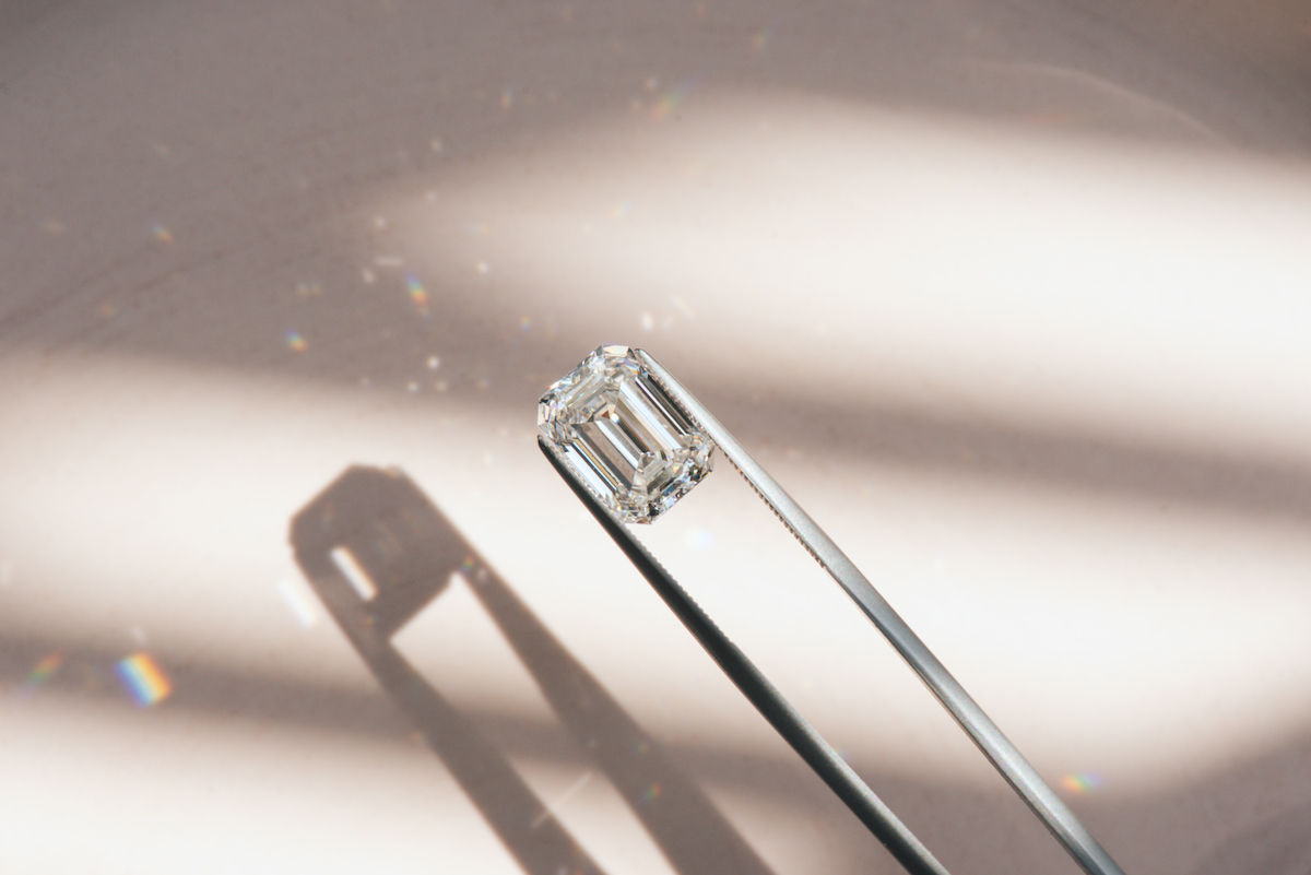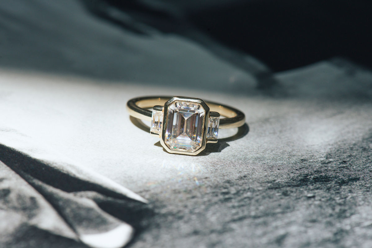 art deco engagement rings - bezel set emerald cut lag-grown diamond