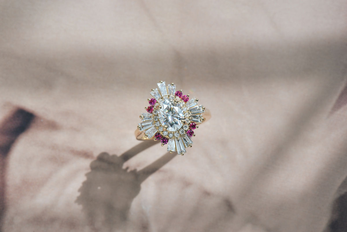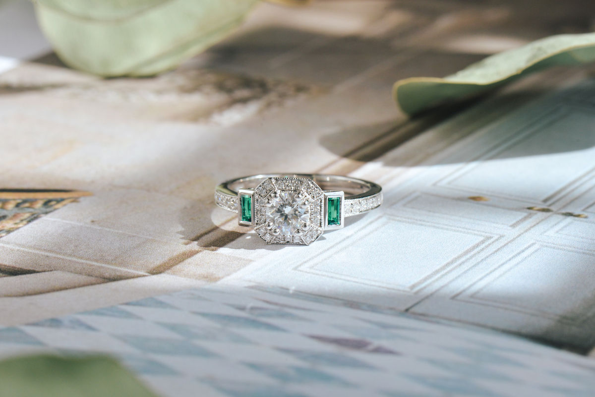 Bring some colour to it! The Art Deco era wasn’t shy with colour.  (Curious about color-driven looks? Check out our green engagement rings roundup.)