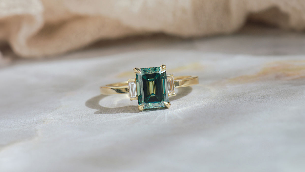 Absolutely not! Moissanite can give the look an elevated rainbow sparkle and effervescence (check out this emerald cut moissanite below!), while colourful gemstones can also bring a touch of vintage bounce to the design.
