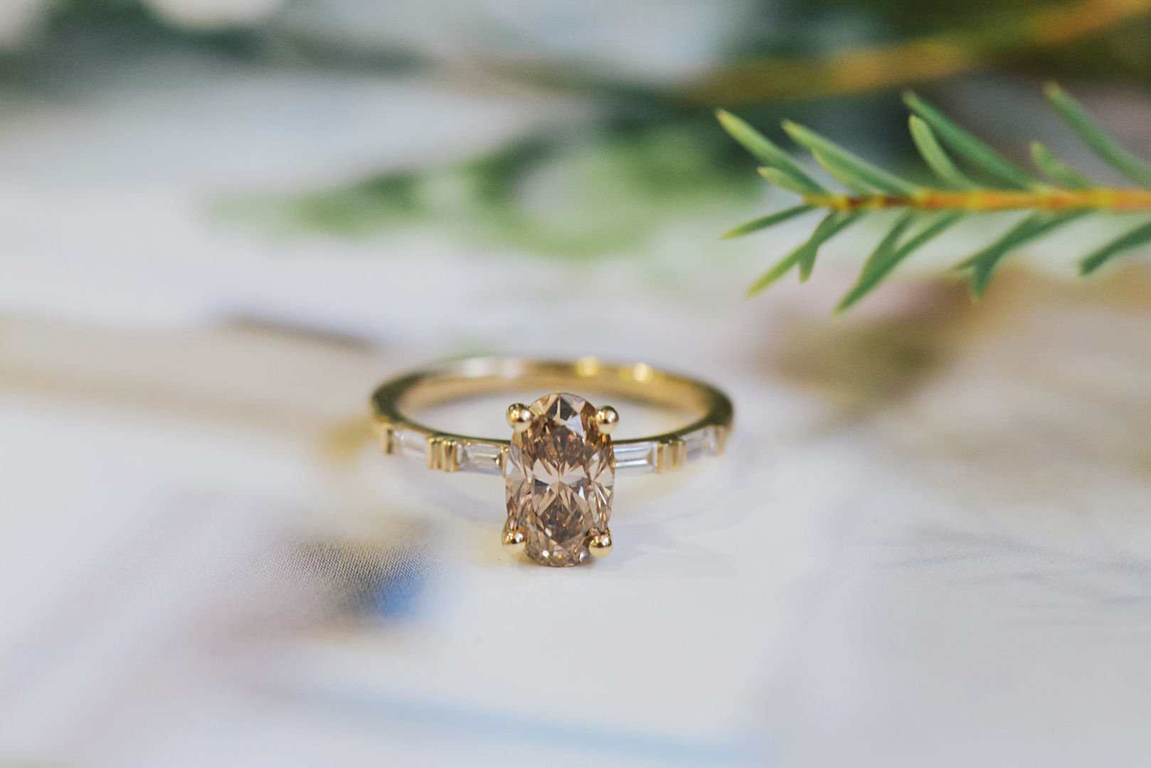 Our couple knew they wanted a champagne-colored oval diamond and after looking at their curated selection of stones that varied in clarity, colour, cut and carat (learn more on the 4Cs here), they picked this beauty.
