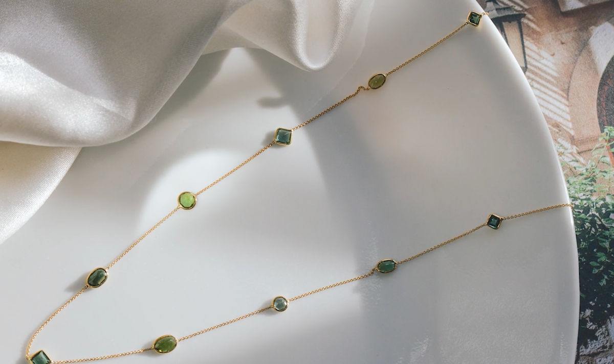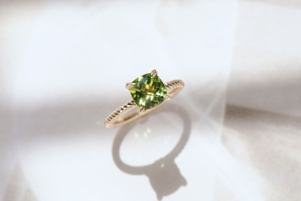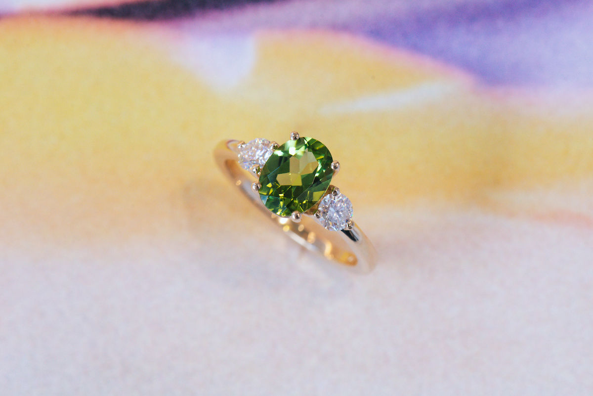 Green tourmaline is one of the most sophisticated greens we’ve seen in a gemstone colour. It has more of an olive-y tone to it, you can really see the yellow undertones within the tourmaline green.
