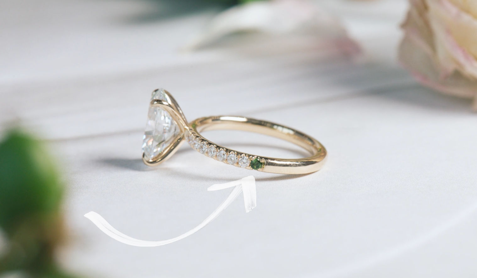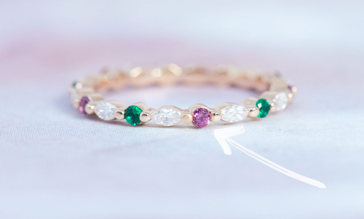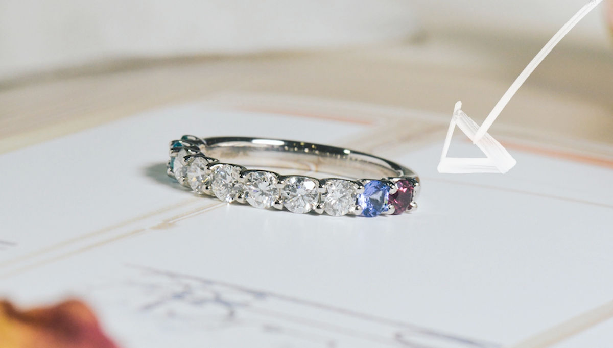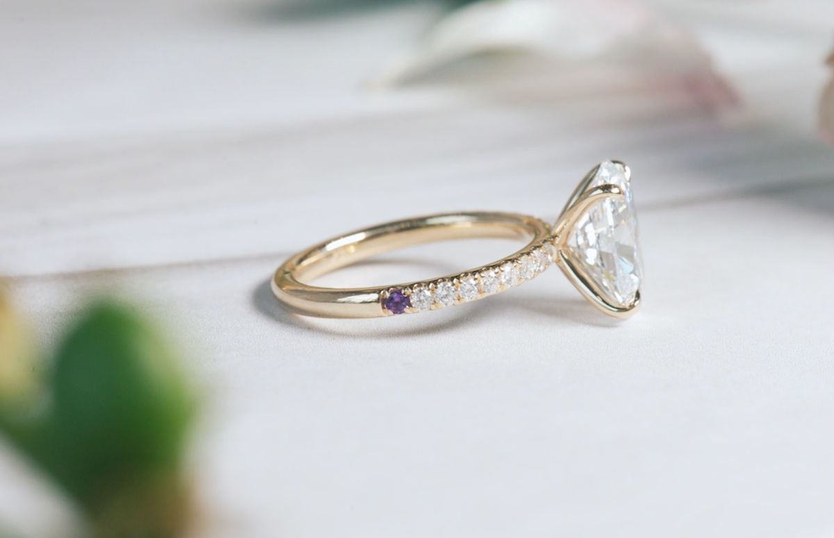One of the most popular ways to make our custom birthstone rings —without taking attention away from the center stone—is what we call the “peek-a-boo” setting.