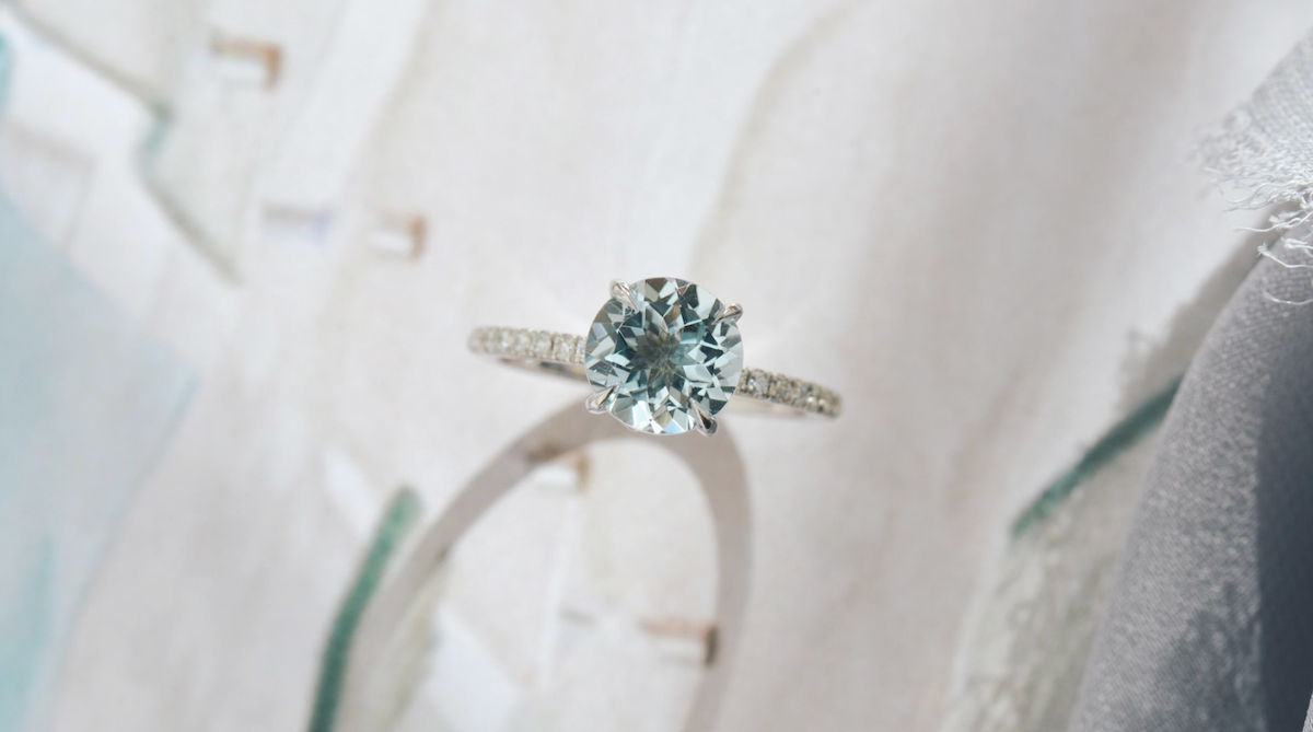 The nature of this blue stone engagement ring is so powdery and watery that in certain lighting settings it almost looks like a white stone with a blue tinge to it.