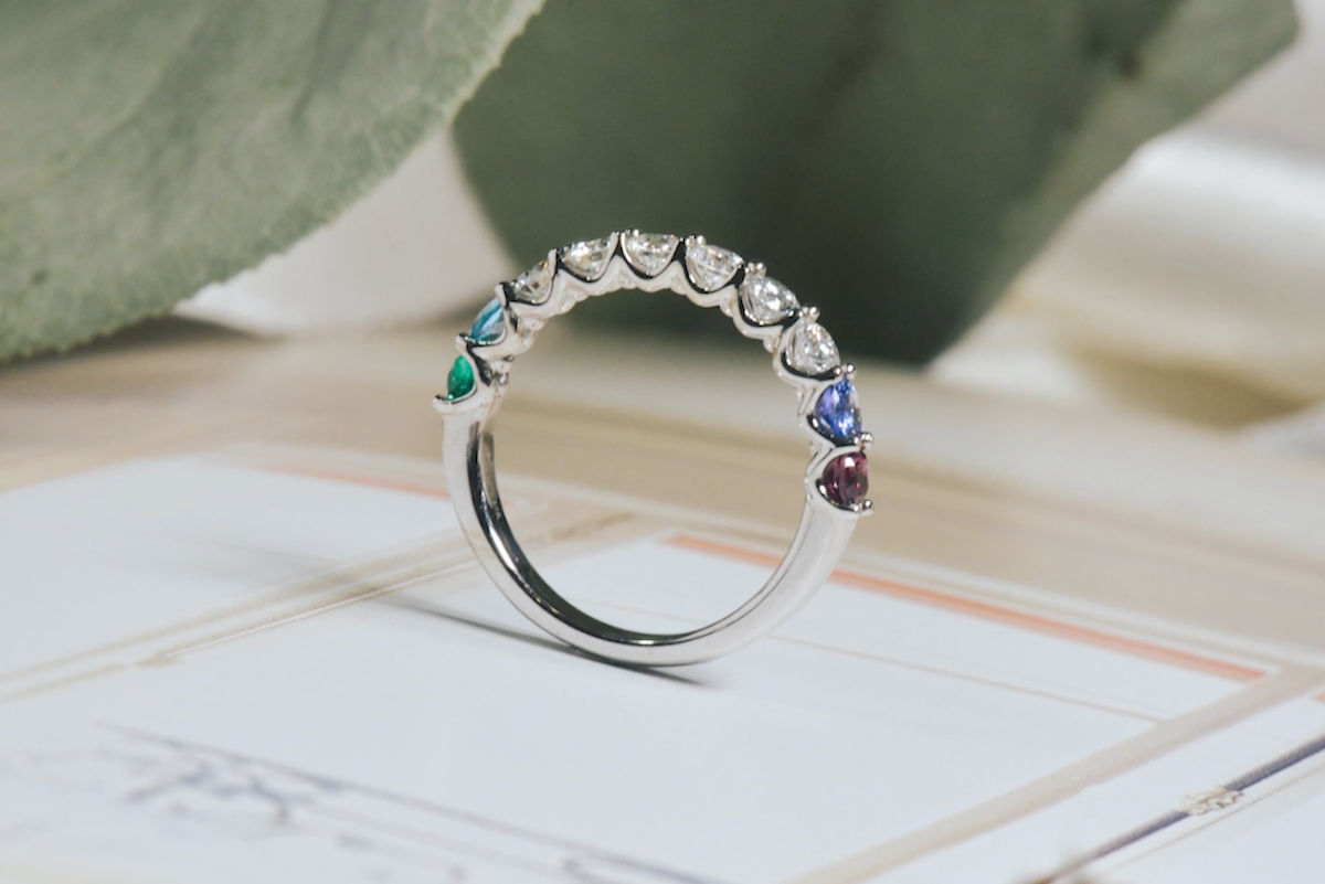 Finally, if you’re not ready to fully embrace color in your engagement ring, another beautiful way to incorporate your birthstones is by setting them on your wedding band. This is the perfect option if you want the sentiment of the birthstones while keeping your engagement ring a timeless, classic white stone palette, set with diamonds.