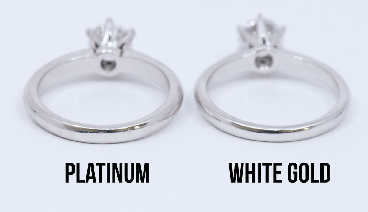 Next: density. Platinum is a very dense metal. If you weigh two exact same rings, one set in 14k white gold and one set in platinum, you can physically feel the platinum engagement ring will be a little heavier.