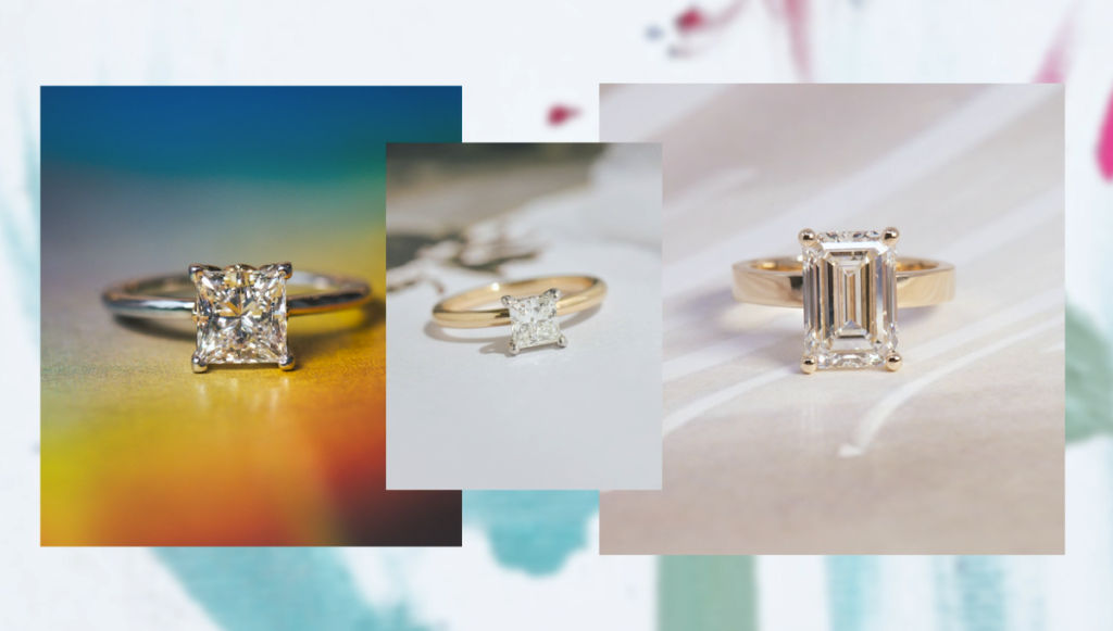 Both the princess cut and an emerald cut have a strong geometric presence, but they achieve very different visual effects: