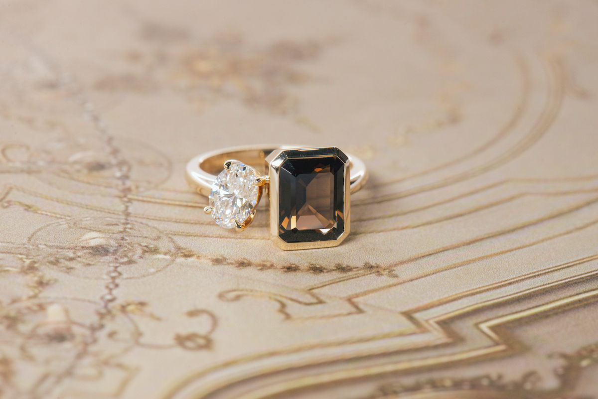 Here’s an example of a toi et moi ring lab grown diamond paired with a smoky quartz creating a stunning contrast.
