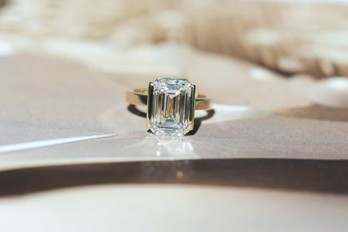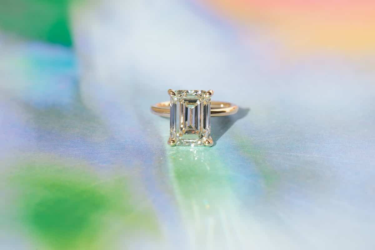 This is why we always encourage our emerald cut engagement ring clients (especially when looking at emerald cut lab grown and natural diamonds) to go higher on colour and clarity. Unlike brilliant-cut stones, with the lively, dynamic sparkle that can mask imperfections, the emerald cut’s crisp, mirror-like panels give you a full view of the entire stone inside and out. Where a faceted brilliant cut sparkles with its energetic “busyness,” the emerald cut commands attention with its serene sophistication, making every detail count.